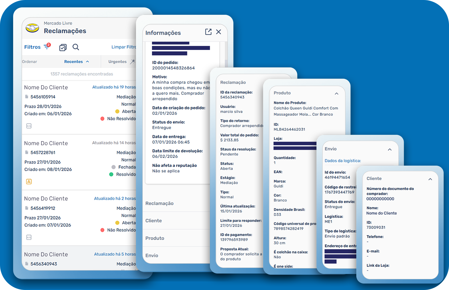 Elimine a troca de telas e o caos operacional. Gerencie mensagens, reclamações e mediações do Mercado Livre, Amazon e Magalu em um único painel, com todas as ferramentas para seu time encantar o cliente.